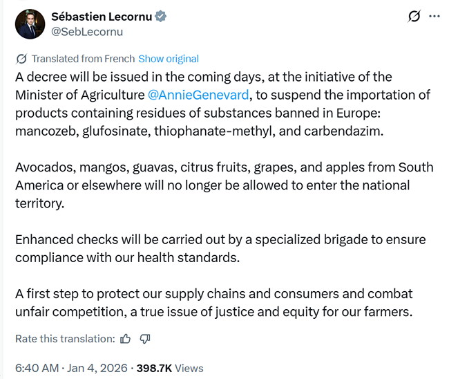 "Regardless of their origin, imported products must comply with our standards,” Genevard said. “France sets an example in Europe by adopting this unprecedented decree covering more than a dozen food products."