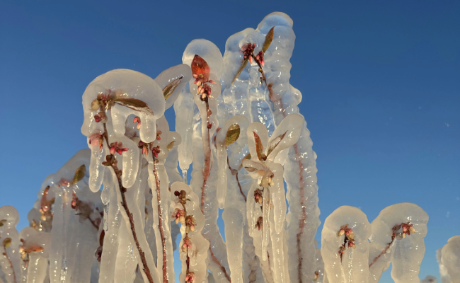 Freeze protection is the continuous overhead spraying of water on field rows to create a thermoprotective layer of ice that keeps the plant and berry temperature above freezing. This process is very meticulous and usually works—unless the air gets too cold. If the thermometer drops below 25 degrees, the heft of the ice breaks leaves and branches, and can even topple over the entire plant. This is what happened in Florida over the weekend.